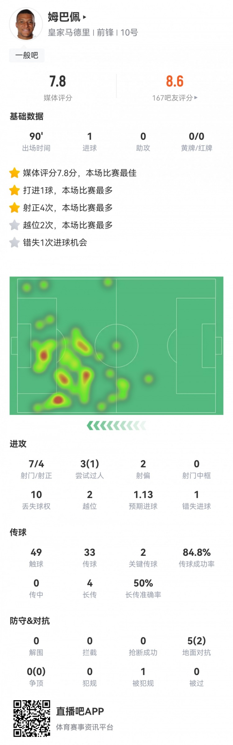 打进制胜球!姆巴佩数据:7射4正1进球,1次错失进球2次关键传球