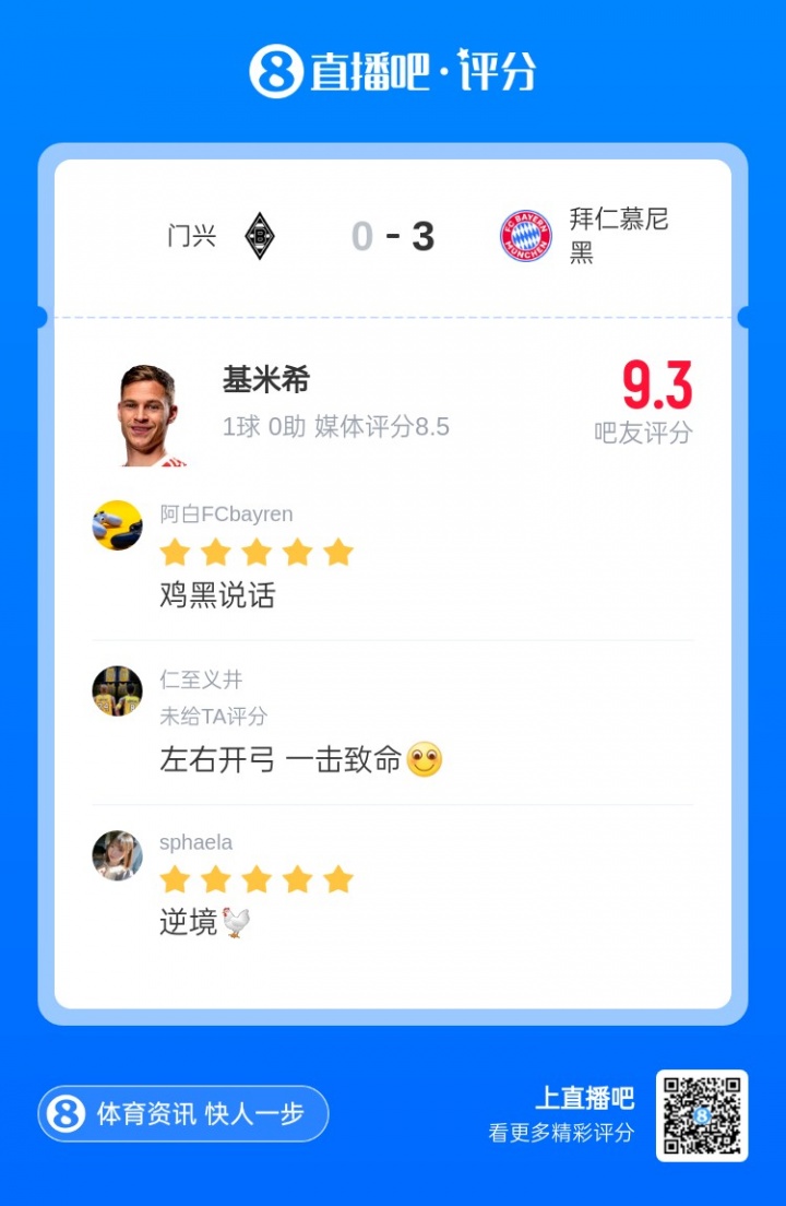 第八轮评比成果出炉,基米希首开纪录,匡助拜仁客场3-0完胜门兴成绩8连胜领跑德甲,最终获取吧友1.4万票复古,当选【X小红书德甲第8轮最好球员】!