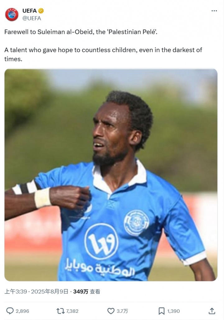08月09日讯 欧足联官方发布帖文,向死于以色列紧迫的巴勒斯坦前国脚奥贝德默哀。