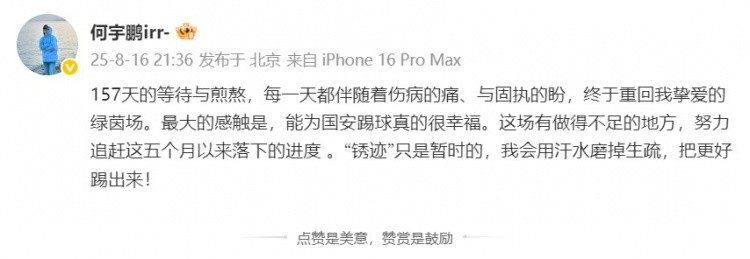 8月16日讯 中超联赛第21轮,北京国安客场3-1打败青岛西海岸。赛后,伤愈复出的何宇鹏发文谈到了我方的感受。