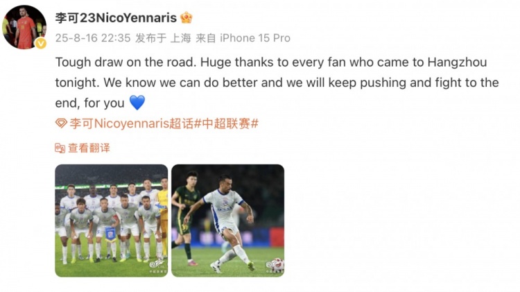 客场战平,恶果用功。真心感谢今晚来到杭州的每一位球迷。咱们知说念咱们不错作念得更好,咱们将不时拼搏,为你们交游到临了一刻。