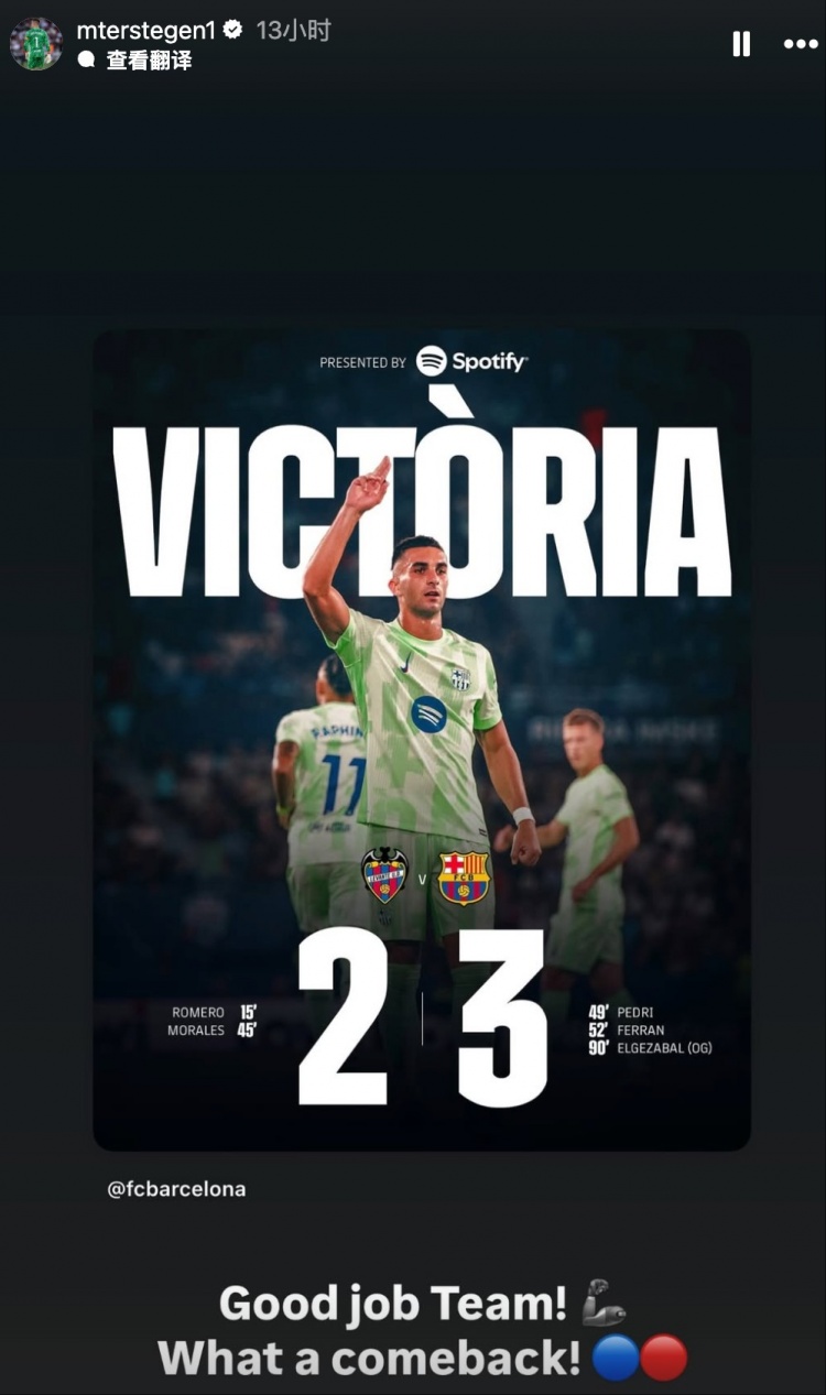 特尔施特根社媒写谈:干得漂亮!队友们🦾果然一场精彩的大逆转💙❤️