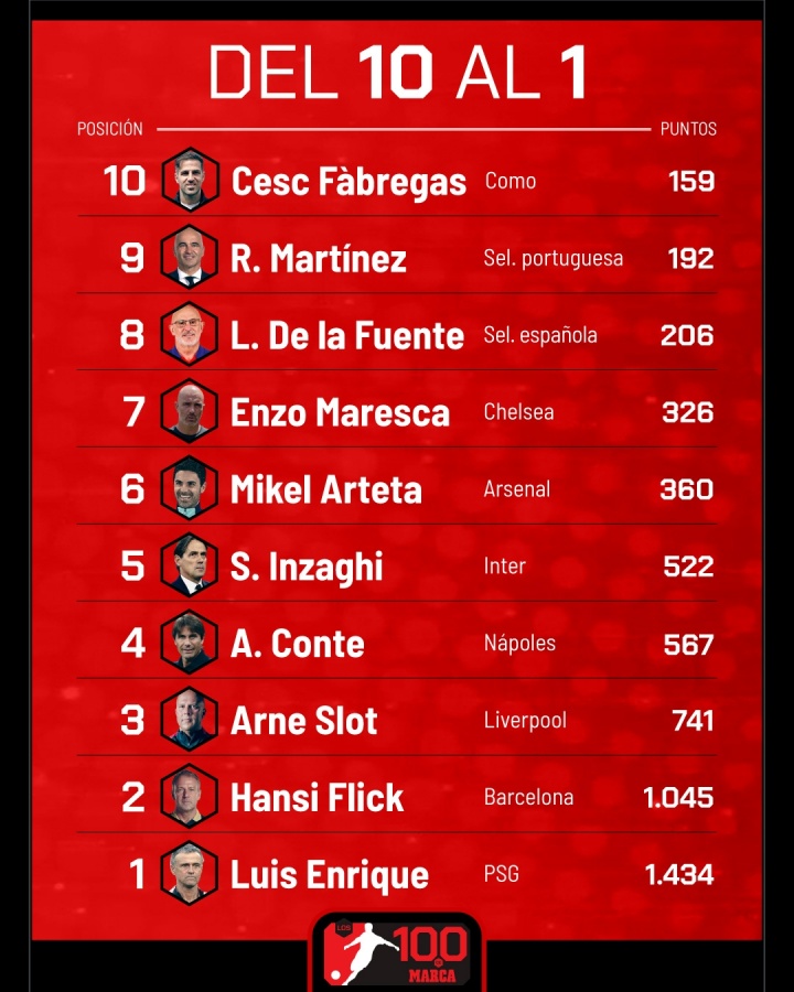 马卡评24/25赛季最好主帅TOP10: