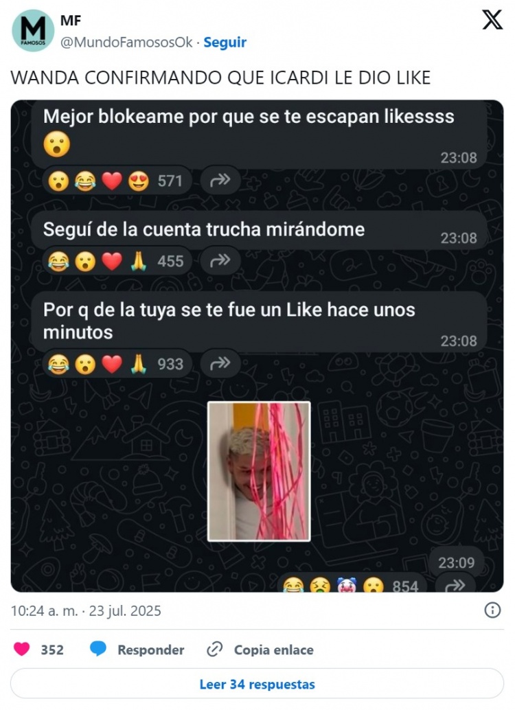 这个举动通过旺达的WhatsApp频说念被揭露,她共享了根据,评释注解尽管伊卡尔迪公开示意对现任女友怜爱不已,但他仍然相配缓和她。 旺达示意:“最佳把我屏蔽了吧,因为你老是不防御点赞我的动态,我要上传截图吗?”图中暴露伊卡尔迪在旺达最近的一张Instagram相片下点赞。