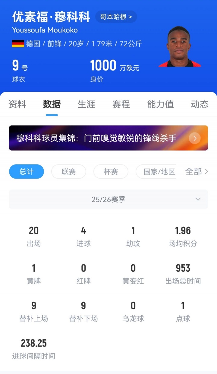 泯...21岁穆科科转战丹麦超连场替补+球荒,20场4球身价1000万