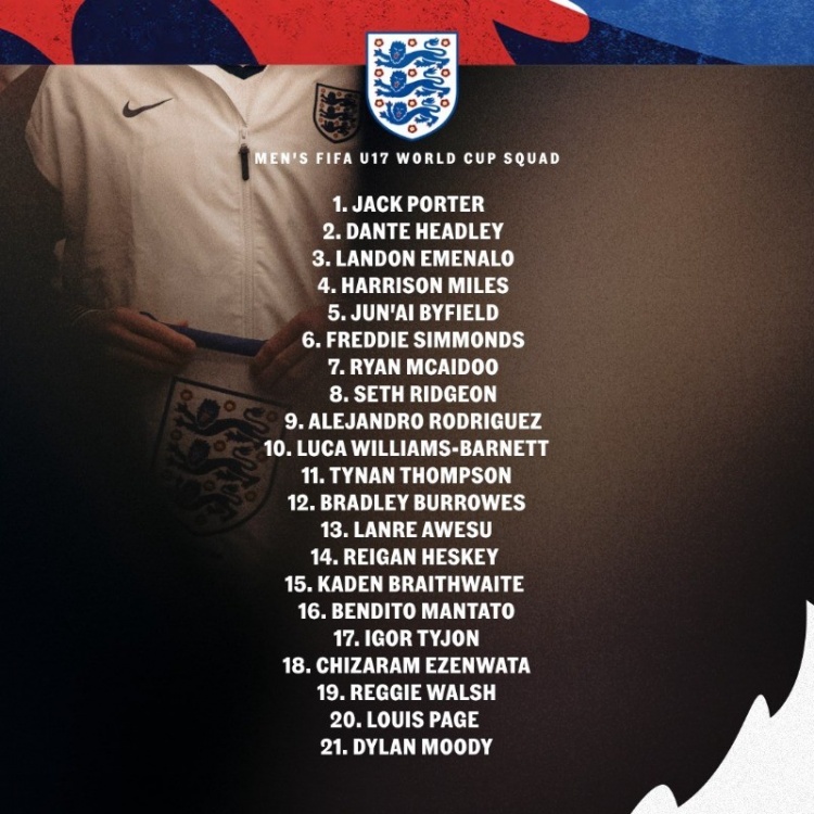 10月21日讯 2025年U17男足寰宇杯将于11月3日至27日在卡塔尔举行,本届赛事将初度扩军至48支球队。英格兰U17公布参赛名单。