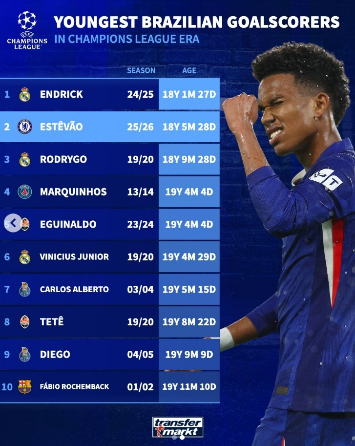 欧冠破门最年青巴西球员榜:恩德里克居首,埃斯特旺次席