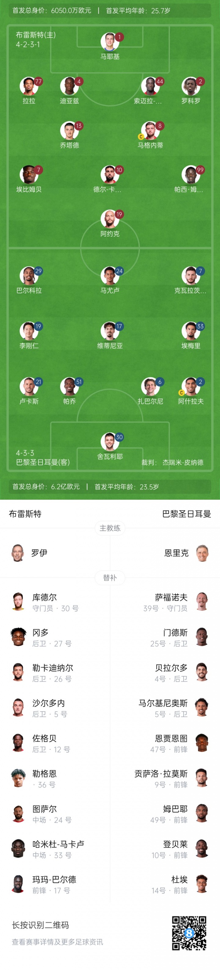 布雷斯特首发:1-马耶基、2-罗科罗、4-迪亚兹、77-拉拉、44-索迈拉-库利巴利、8-马格内蒂、7-埃比姆贝、13-乔塔德、99-帕西·姆布普、10-德尔·卡斯蒂略、19-阿约克