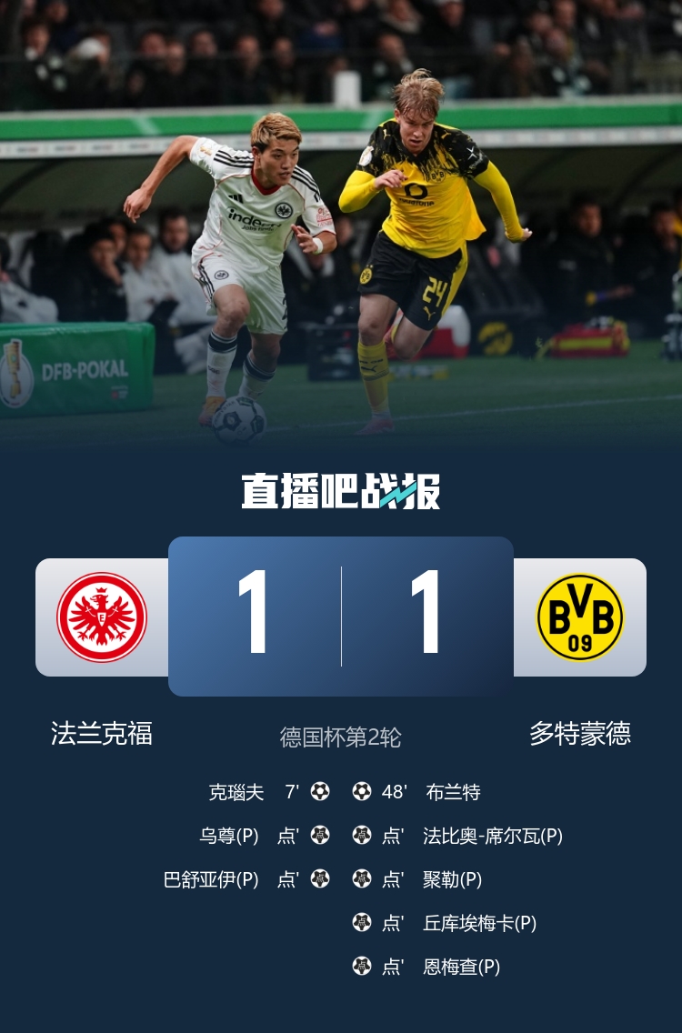 布兰特破门,多特质球大战5比3法兰克福晋级第三轮。