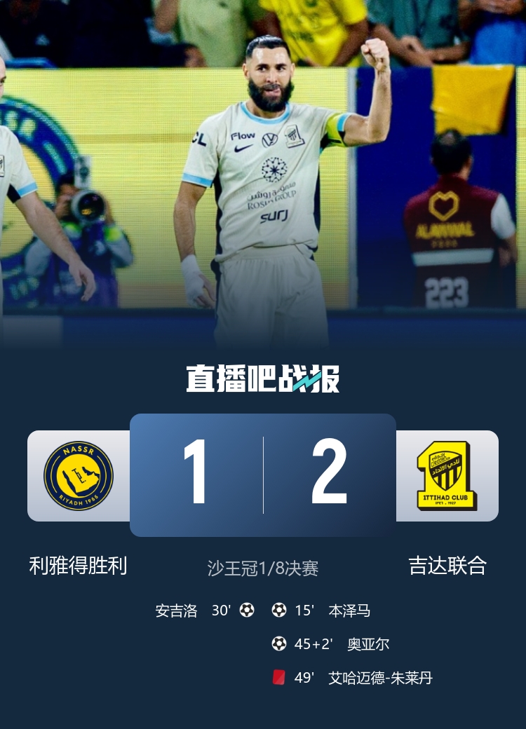 本泽马推射破门,奥亚尔抽射立功,最终利雅得顺利1-2十东说念主吉达勾搭无缘八强。
