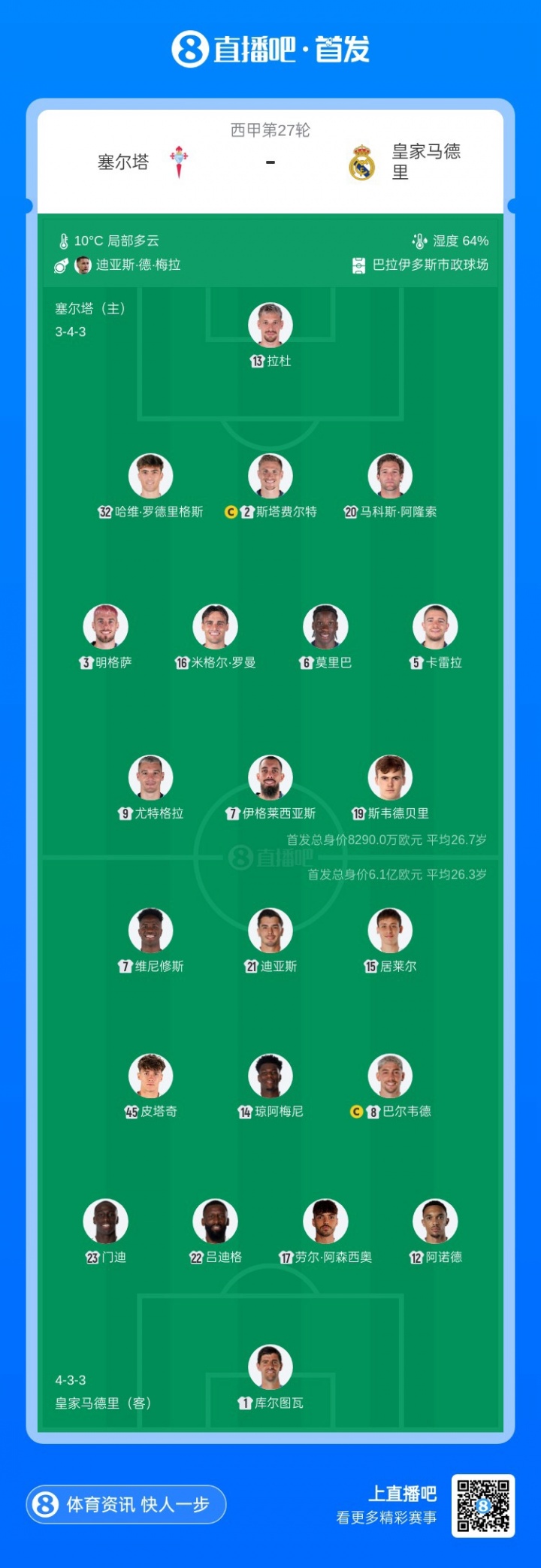 3月7日讯 西甲第27轮,塞尔塔本场赛事迎战皇家马德里,赛前首发球员阵容名单公布。