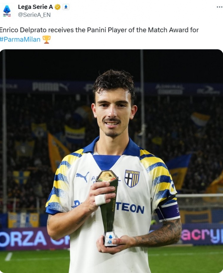 打入扳平进球,意甲官方:帕尔马后卫普拉托当选战平米兰全场最好