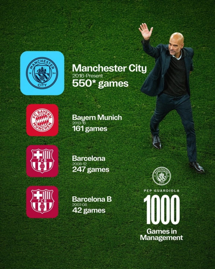 🏆已是据说!瓜迪奥拉当天迎握教生存1000场,前999场715胜39冠