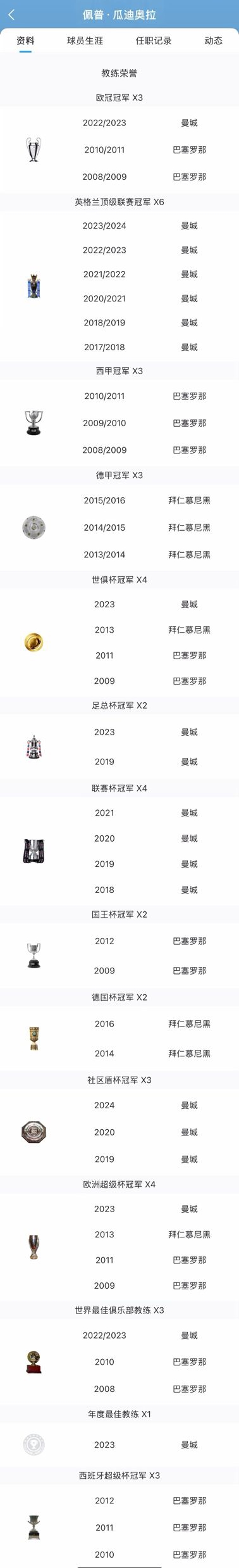 在18年的握教生存里,瓜迪奥拉先后相易巴萨、拜仁以及曼城斩获了总共39座伏击冠军奖杯。