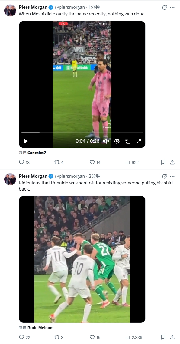 摩根写说念:“太好笑了,C罗真的因为不服别东说念主拉他的球衣而被罚下场。”