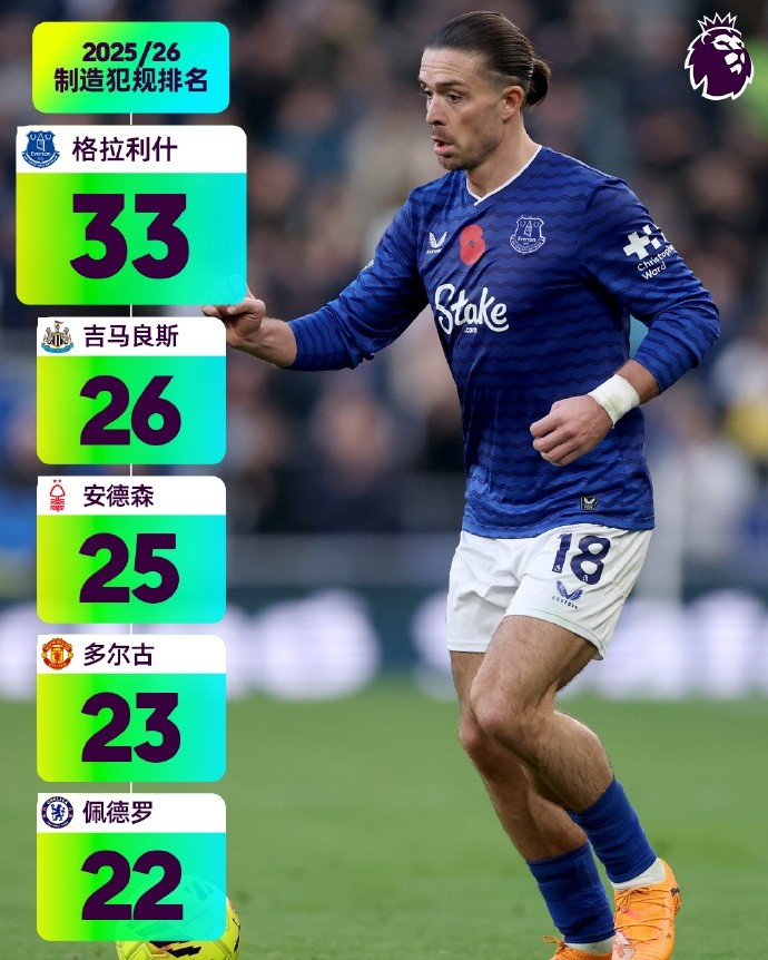11月16日讯 英超11轮事后,官方共享数据制造犯规排行,埃弗顿的格拉利什以33次高居榜首,吉马良斯和安德森分列二、三。