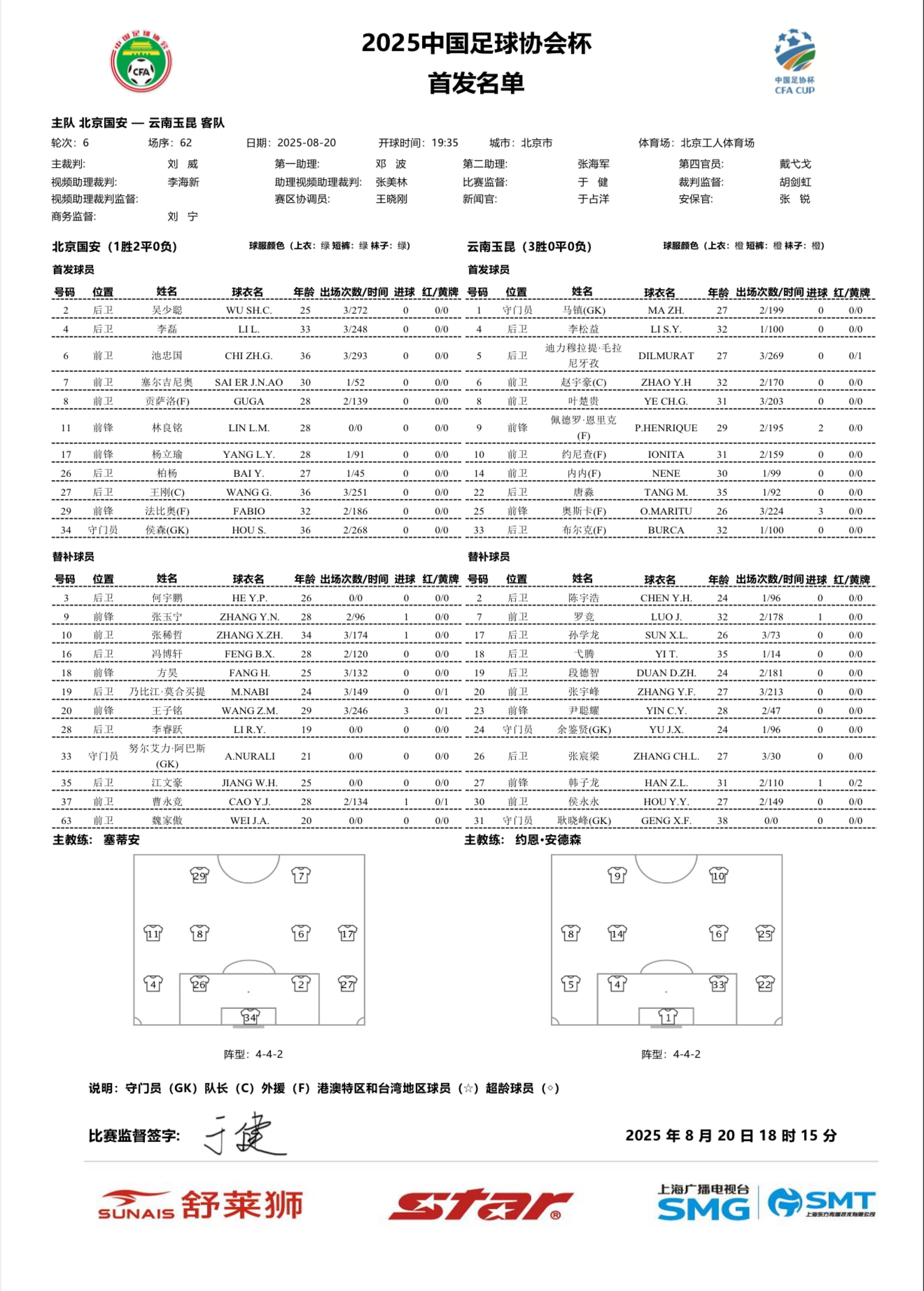 北京技术8月20日19:35,足协杯半决赛,北京国安对阵云南玉昆,本场比赛主裁判是刘威,VAR是李海新,赛前两边公布首发: