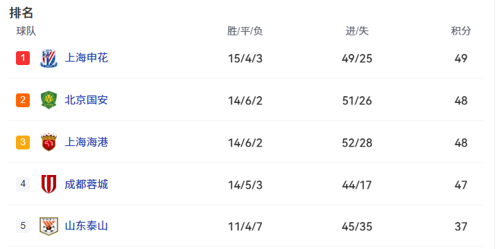 现在,中超积分榜前四名的球队中,分差只好2分!这也意味着,蓉城队、海港队以及国安队,3队将与申花队争抢第又名的位置。他们此番面临武汉三镇的比赛,压力一样不小。